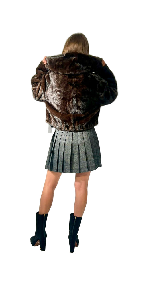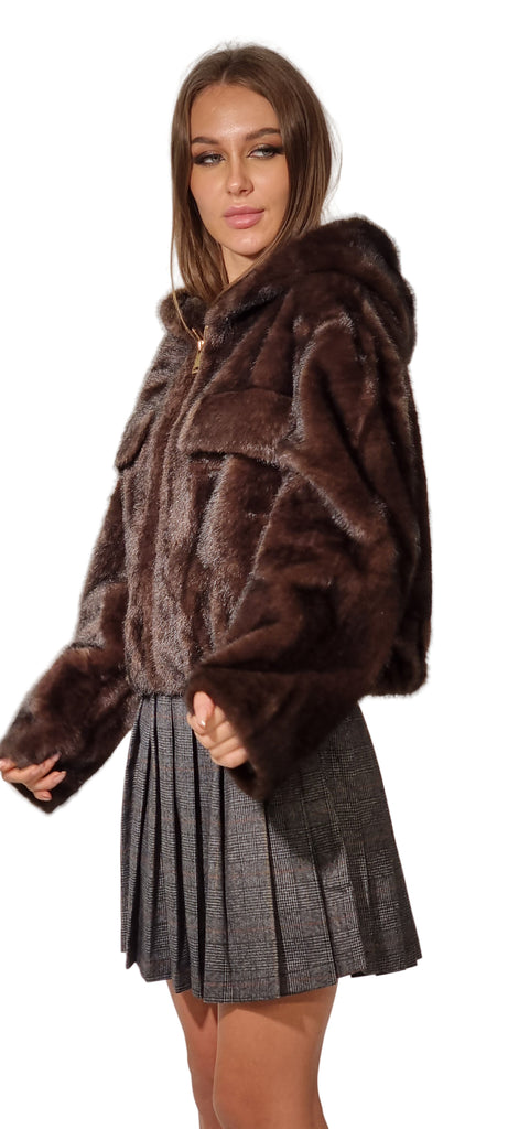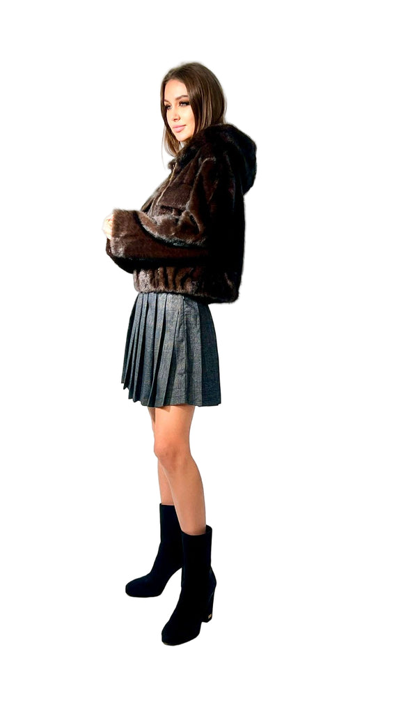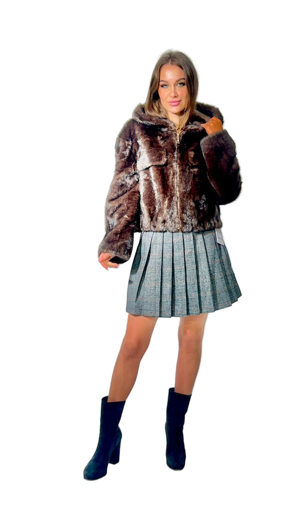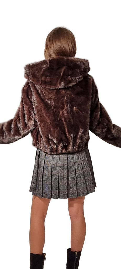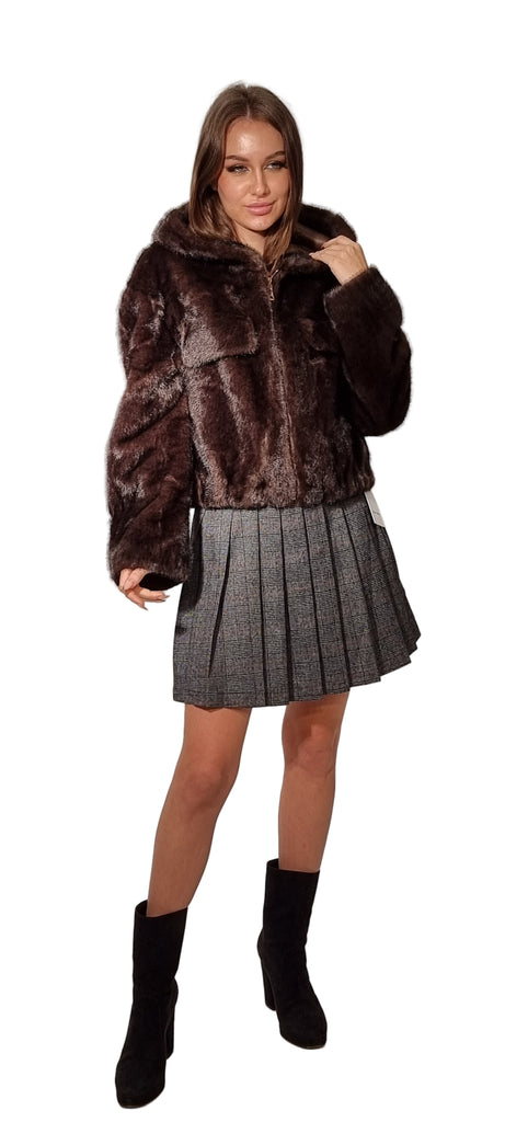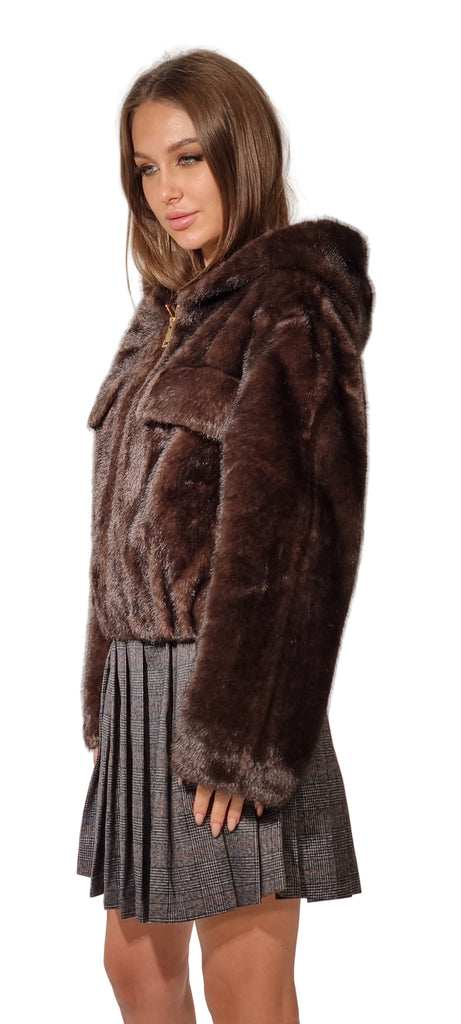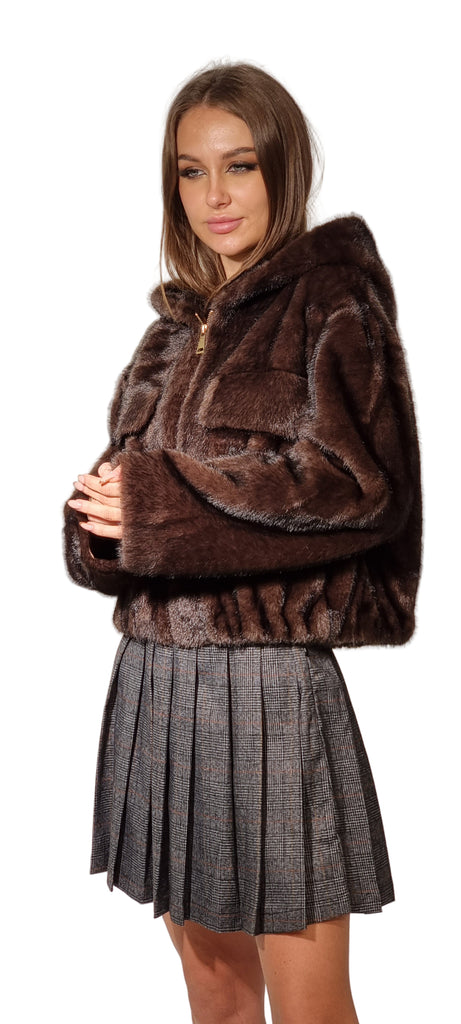LT Cropped Fur Jacket In Hood With Zipper Coffee Color