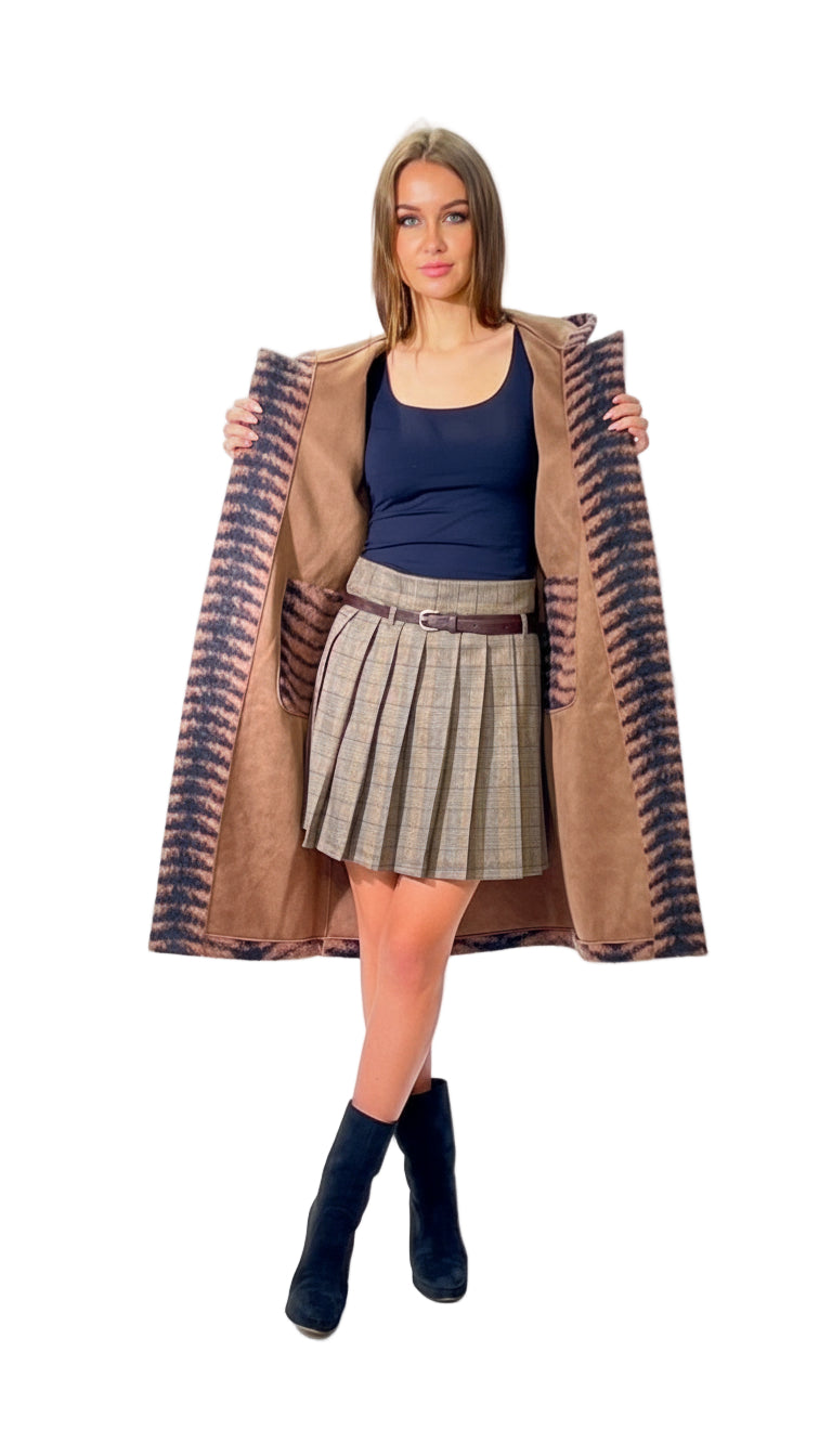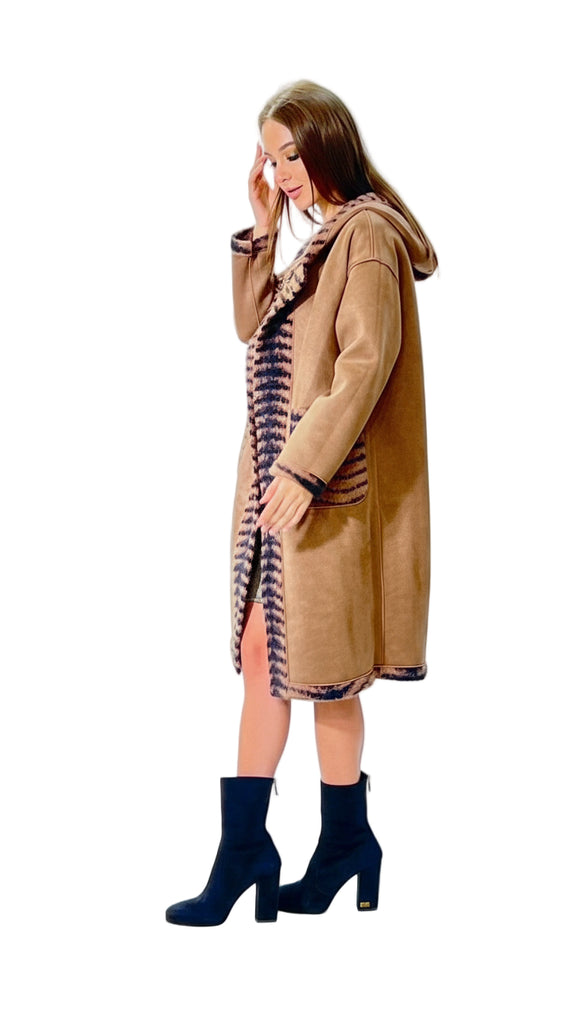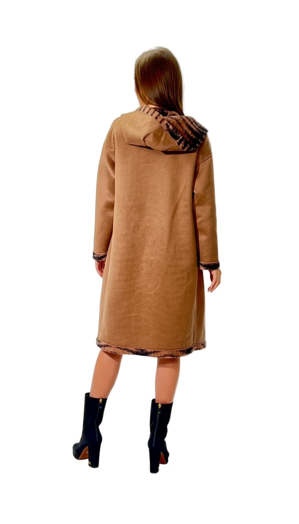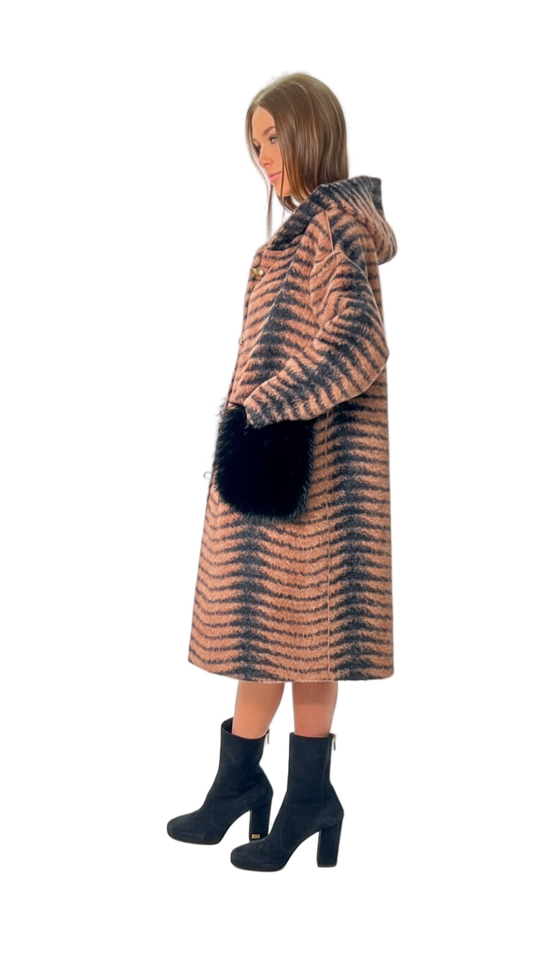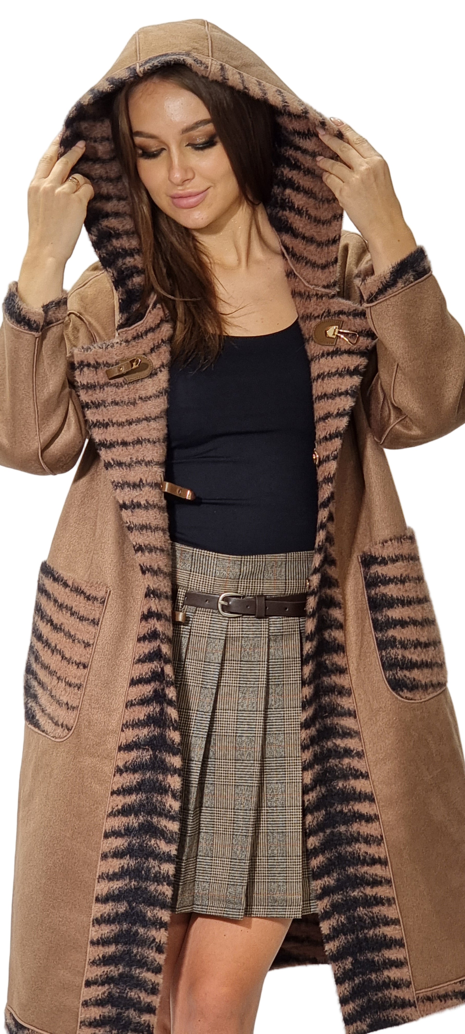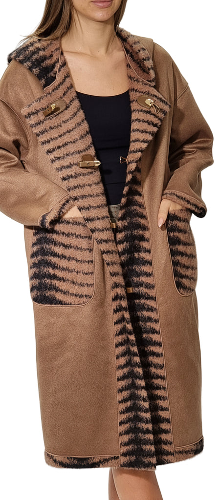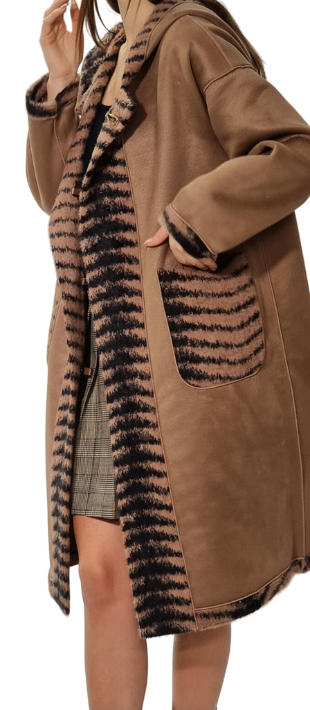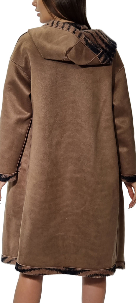 LT Reversible Hooded Long Coat Tiger Print Coffee Color